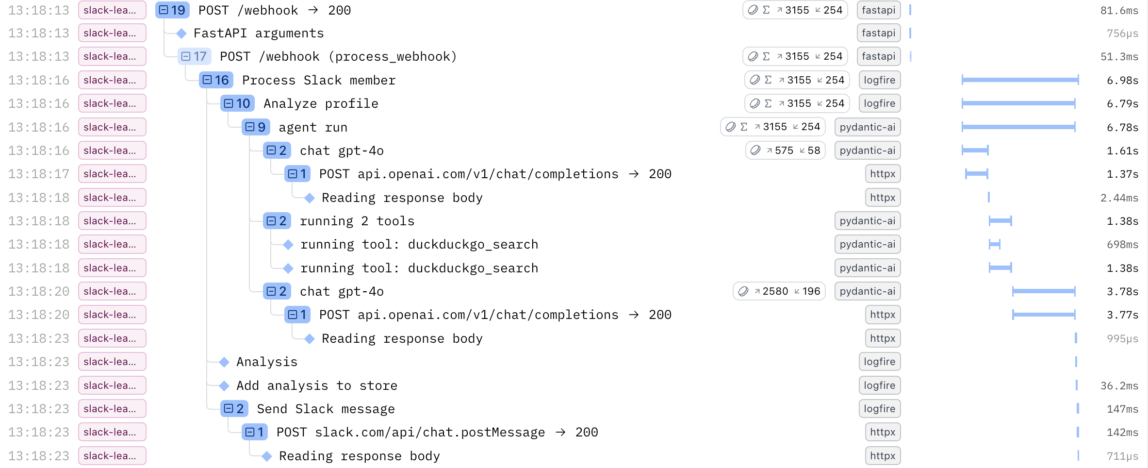 Now when someone new (possibly you with a throwaway email) joins the Slack workspace, you'll see the webhook event being processed in the terminal where you ran modal serve and in the Logfire Live view, and after waiting a few seconds you should see the result appear in the #new-slack-leads Slack channel!